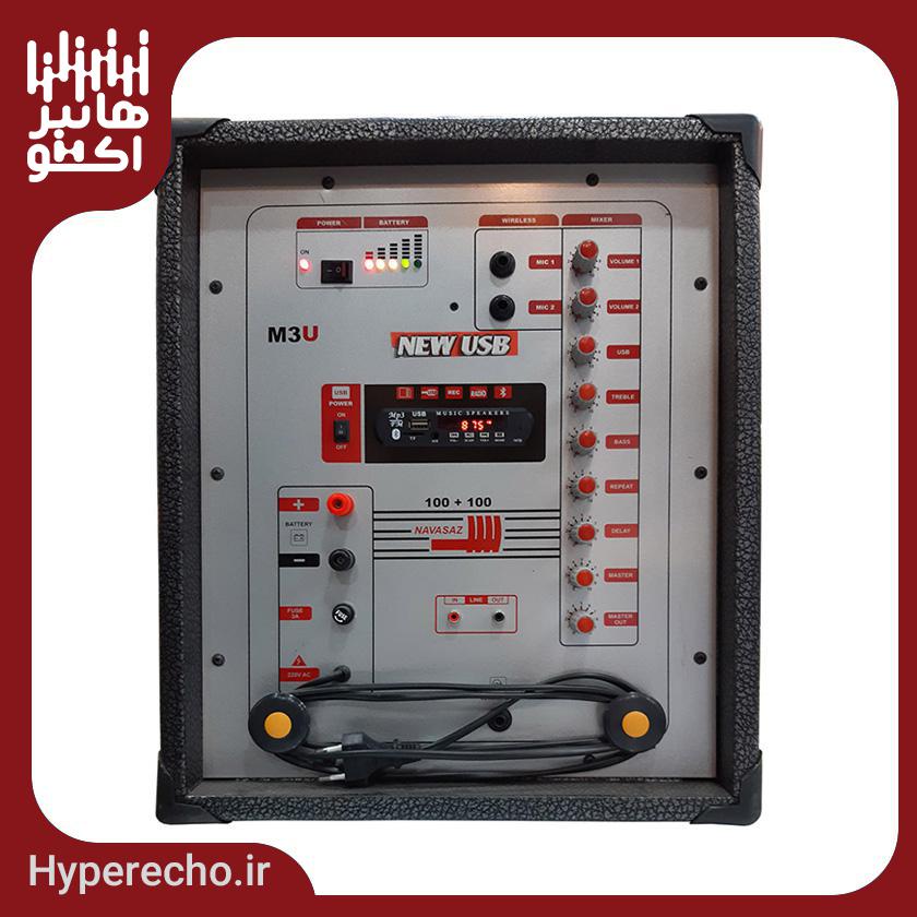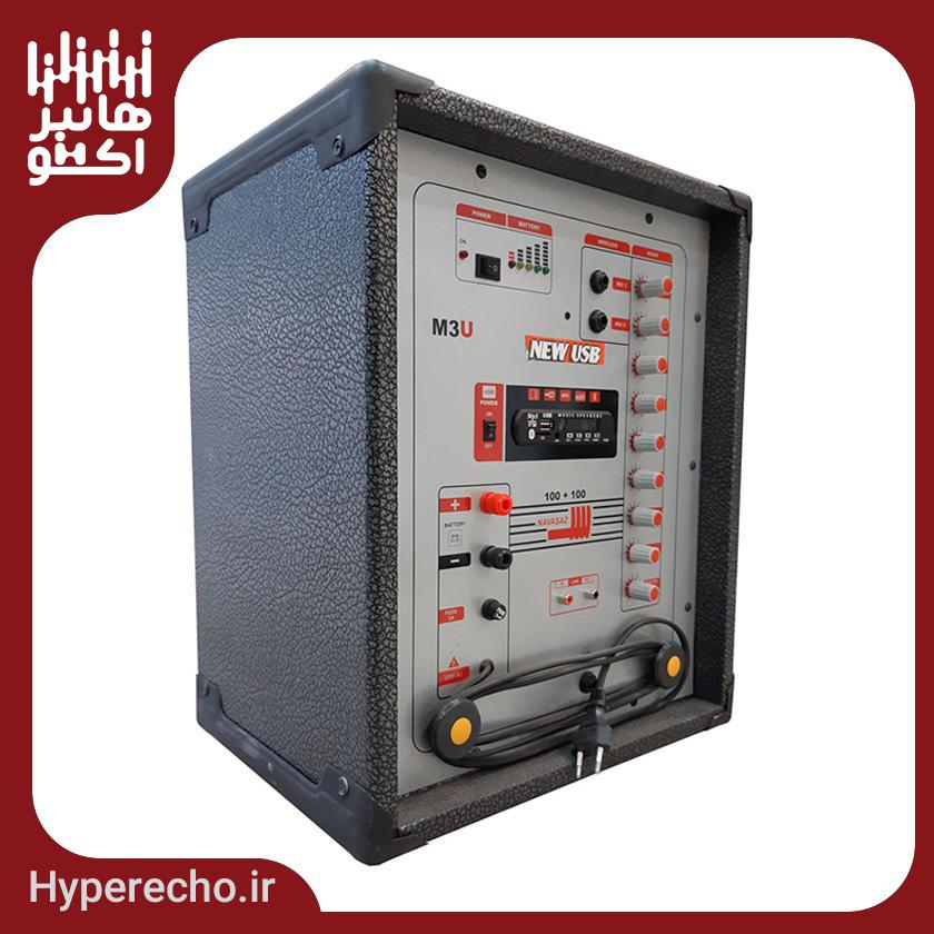 اکو آمپلی فایر پرتابل نواساز مدل NAVASAZ M3U از محصولات برند AVACHANG محسوب میشود. M3U محصول شرکت آواچنگ، سالهای متمادی پیشتاز در عرضه اسپیکرهای شارژی پرقدرت و با کیفیت در بازار ایران میباشد. در تولید این محصول از یک اسپیکر 12 اینچ فول رنج در دامنه 60 هرتز الی 20 کیلوهرتز استفاده شده است. 2 ورودی میکروفن و یک ورودی لاین و AUX، در کنار یک ماژور جهت پخش فلش مموری و اتصال به بلوتوث از دیگر قابلیتهای این محصول پرطرفدار است. 2 ولوم مجزا جهت 2 ورودی میکروفن، 2 ولوم اکو، 2 ولوم اکولایزر، 2 ولوم نهایی جهت صدای اسپیکر داخلی و اتصال به یک اسپیکر خارجی موجود در این دستگاه وظیفه دریافت و پخش یک صدای باکیفیت را بر عهده دارد.